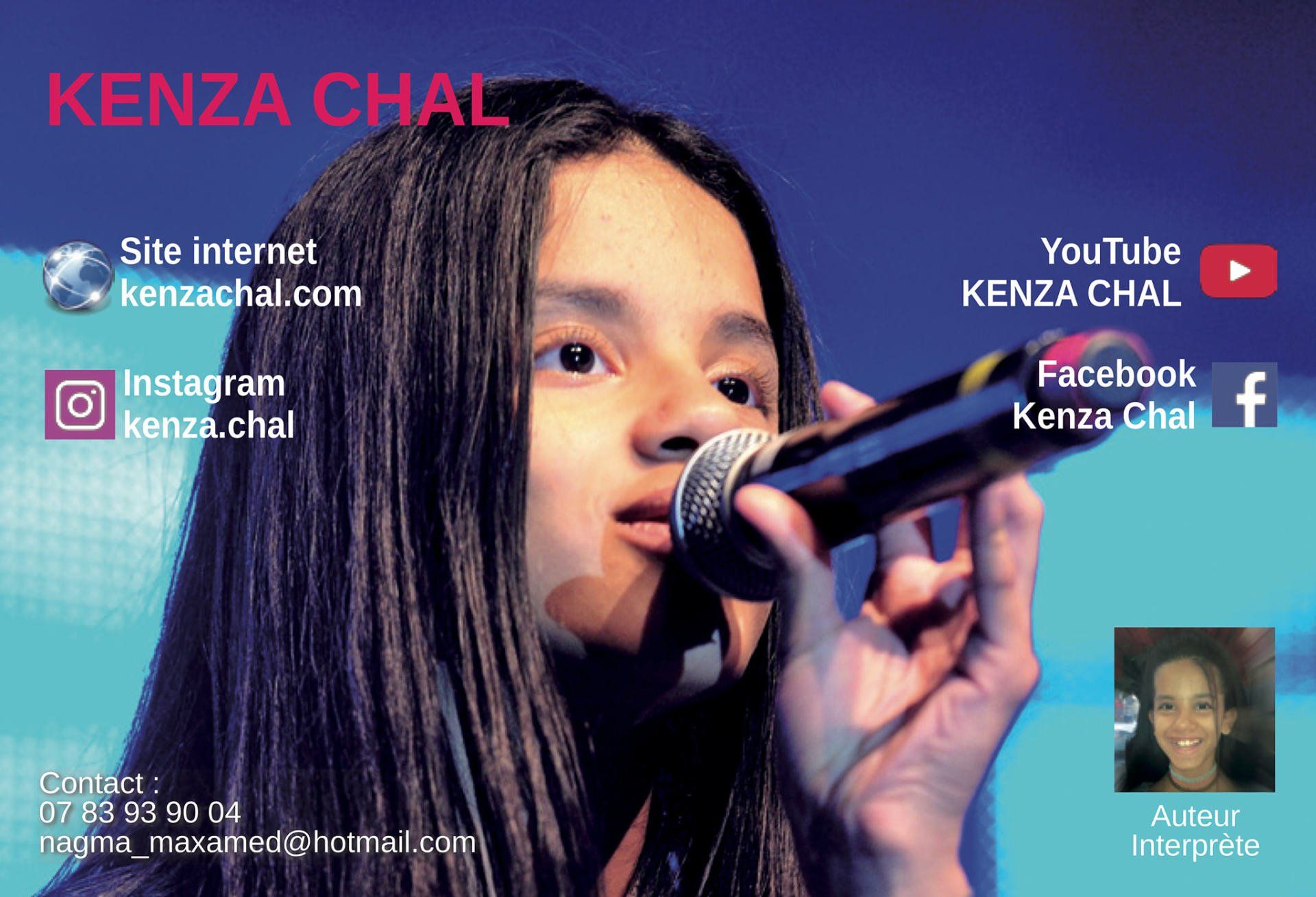Kenza, alias @KENZA CHAL (seudónimo de mis redes sociales), 13 años, autor miembro de Sacem e intérprete. Apasionado por el canto desde muy joven, también hago break dance y piano. Durante dos años, salgo al escenario todos los fines de semana para actuar en público en varias ocasiones en toda Francia (1er parte, Ehpad, Festivales, elección de Miss, conciertos de caridad, etc.) Mis 5 temas EP Kenza Chal está fuera en todas las plataformas de descarga legal (también disponible en formato físico), los nombres de los títulos: 1-SAME IF - habla de tolerancia 2-LÉONIE - en homenaje a Léonie, quien murió de cáncer cerebral a la edad de 10a 2 -PAPA - en homenaje a todos los papás 3-MY 3 PASSIONS - música, baile y piano 4-LITTLE FELICIDAD - Sobre la felicidad en general Mini Álbum KENZA CHAL: Enlaces al orden, SINTONÍAS: http: // itunes.apple.com/album/id1503321284?ls=1&app=itunes MÚSICA DE MANZANA: http://itunes.apple.com/album/id/1503321284 SPOTIFY: https://open.spotify.com/album/2AFtcTXrOYj5x4nmgOiNtx AMAZON: https://www.amazon.fr/Kenza-Chal/dp/B0865NNY1V/ref=sr_1_1?__mk_fr_FR=ÅMÅŽÕÑ&dchild=1&keywords=KENZA CHAL&q id = 1585844282 & sr = 8-1 Si desea el álbum en formato CD, comuníquese con: nagma_maxamed@hotmail.com (o en Facebook, etc.) Aquí está mi sitio web en el que pongo mis eventos, mis clips, mis singles y todos mis noticias por venir Feliz lectura y muchas gracias a todos los que me apoyan - Kenza Chal